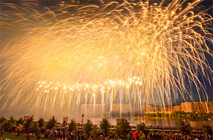 Многоуровневый фейерверк начинает работать на высоте от 7 метров и заканчивается грандиозным финалом на высоте 120 метров. Запуск производится из 21 точки. Программа включает в себя наземные пиротехнические элементы (фонтаны, вспышки и динамичные фигуры), парковый фейерверк и высотные залпы калибром от 60 мм до 100 мм.